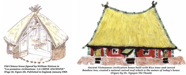 Người Tàu có văn hoá và có kiến thức vẫn biết tổ tiên của người Hán có nguồn gốc Mông-Cổ, có con vật tổ là Cọp trắng, với nhà truyền thống cổ là nhà gốc du mục hình tròn (xem “Les premières civilisations LA CHINE ANCIENNE”, trang 28-29, của ông William Watson xuất bản năm 1969 tại Grande Bretagne) (Hình 6, Bs Thanh vẽ lại hình nhà khảo cổ của ông William Watson). chứ không phải nhà hình chữ nhật cao cẳng hay không, với những nét cong cong đặc trưng của các góc mái nhà, của 2 đầu giường ngủ, 2 đầu thuyền như ngày nay. Trong lúc đó nhà cổ của Bách Việt là nhà hình chữ nhật 3 gian và 3 gian 2 chái làm bằng tranh và tre cong cho chắc chắn, dần dà sinh ra mái cong cong. (Hình 7, Bs Nguyễn Thị Thanh vẽ, phỏng theo nhà minh khí chôn theo người chết bằng đất nung thời Âu Cơ và Hùng Vương tìm thấy trong văn hóa tiền sử). Nhà hình chữ nhật của Bách Việt từ thời Âu Cơ cách đây trên 6000 năm: Những cây tre cong cong làm nhà với chiều cong đưa lên trời để căn nhà có thế vững vàng. Người Trung Hoa gốc Mông Cổ thấy nhà, giường ngủ, thuyền bè của dân Trung Hoa gốc Bách Việt có nghệ thuật tuyệt vời với dáng cong cong nên phát triển thành nhà ngói có mái cong cho cung điện triều đình và chùa chiền. Sau nầy Đại Hàn và Nhật Bản cũng bắt chước.