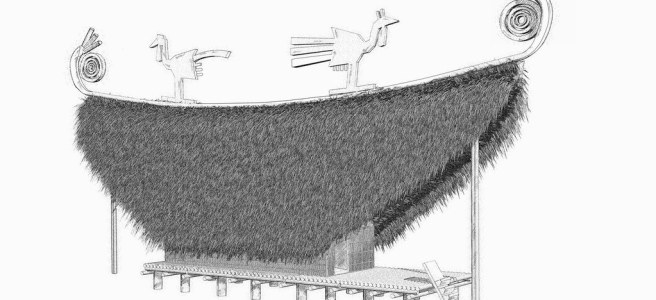 Dựa vào số tư liệu kể trên, nhà mái thuyền được vẽ phục dựng như sau. Giả thuyết rằng những con chim trên mái nhà là chim gỗ dùng để trang trí chứ không phải chim thật:
