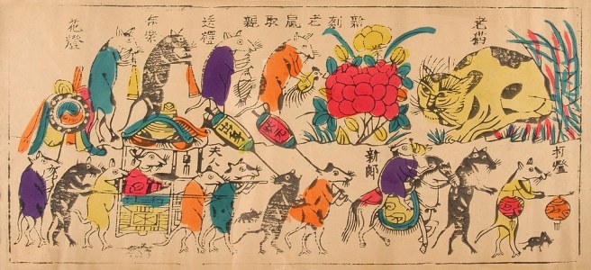 Cũng chính vì lòng tôn kính này mà mặc dù về sau, khi con người dần dần làm chủ được tự nhiên và thuần hóa được muôn vật, Chuột vẫn còn được dùng để biểu trưng cho điều tốt đẹp: ”Nhất là đom đóm vô nhà/ nhì là chuột túc/ thứ ba bông đèn”, biểu hiện cho sự thông minh, dí dỏm qua câu chuyện cười dân gian ”Chuột và cóc”. Chuyện rằng: Chuột và cóc thân nhau đã lâu, cóc rất muốn lên thăm nhà bạn, nhưng chẳng biết cách nào leo lên vì nhà chuột ở tận ngọn cau cao. Chuột bèn nghĩ kế và bảo cóc: ”Anh ngậm chặt lấy đuôi tôi, tôi sẽ đưa anh lên thăm nhà”. Nghe lời bạn, cóc ngậm chặt đuôi chuột. Khicả hai vừa lên gần đến ngọn cau thì chuột vợ đon đả chạy ra lễ phép: “Chào anh cóc”. Cóc vội đáp lời: ”Chào chị!”. Liền lập tức, cóc rơi tỏng từ ngọn cau cao xuống đất, gãy cong cả lưng. Chờ cho bạn bớt đau, chuột chồng lại bảo: ”Lần này, anh nhớ ngậm kỹ vào, và vợ tôi có ra chào, xin anh cũng lặng im, đừng nói gì hết”. Nghe có lý, cóc bớt sợ và lại ngậm đuôi chuột. Vừa đến nơi, thấy chuột vợ chạy ra, cóc vội vã: ”Tôi không nói nữa đâu!”. Lại lập tức rơi ngay xuống đất. Lại gãy lưng thêm lần nữa, nên cho đến bây giờ khi đến những ngày chuyển trời, loài cóc vẫn còn nhức xương vì chấn thương di truyền, luôn nghiến răng đau đớn. Cũng có lẽ do chính sự tinh khôn này, mà trong tranh dân gian Đông Hồ, bức ”Đám cưới chuột” được mọi người yêu thích vì sự ngộ nghĩnh, đáng yêu của nó.