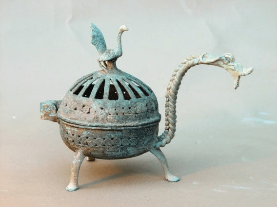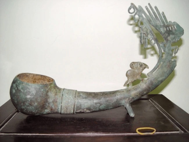 Chiếc muôi Đông Sơn dùng trong lễ thiêng dáng thuyền chiến với tượng một chú bồ nông (hay chim Hồng Hoàng) dùng mỏ lớn cặp một con ếch đang giãy chết