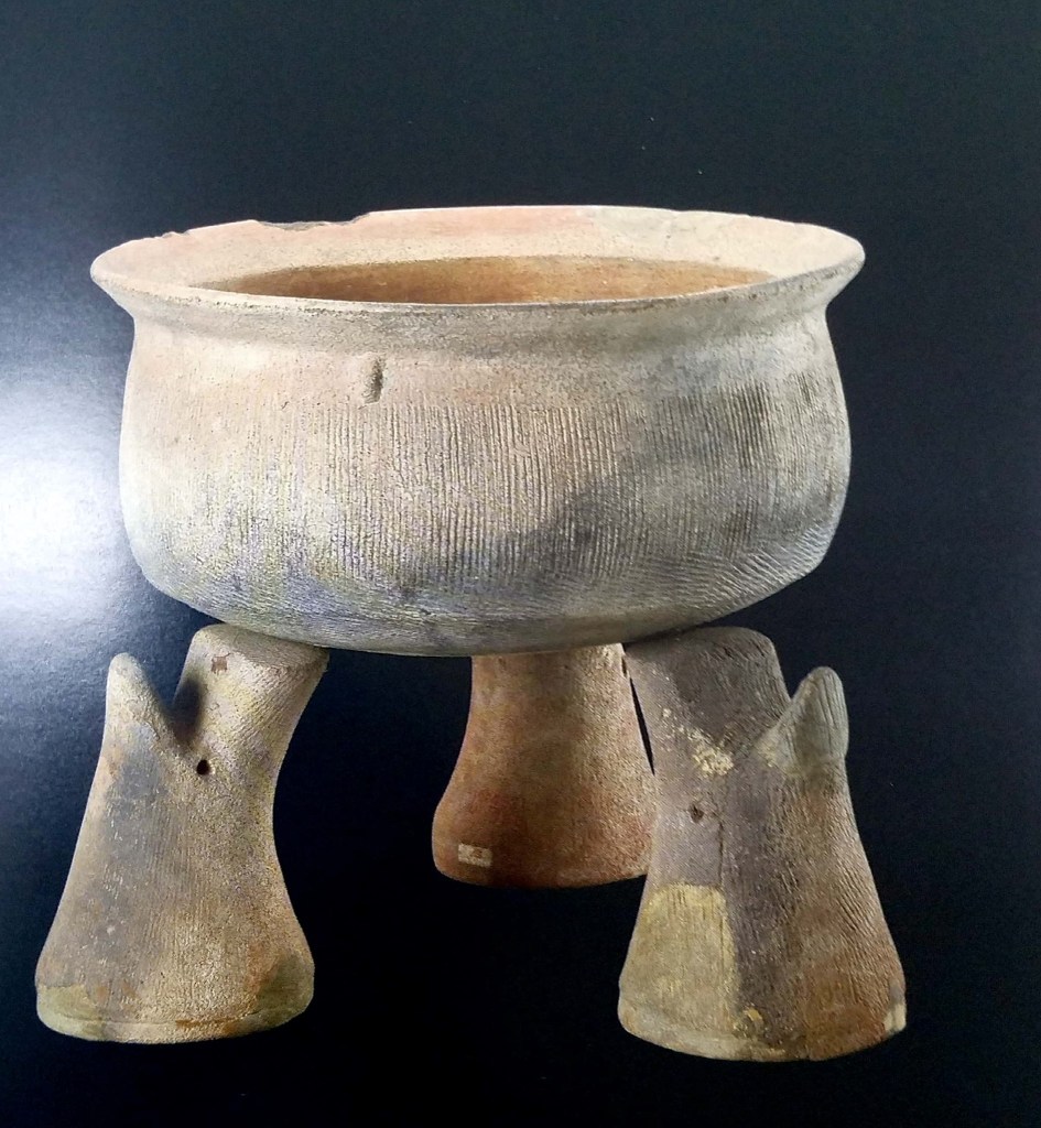 Cổ vật gốm có thể nói là một loại hình đặc trưng và ít thay đổi qua thời gian, cổ vật gốm tại các vùng có sự di cư tới của các cư dân tộc Việt thể hiện sự tương đồng rất rõ. Nồi gốm cùng chạc gốm như dưới đây được tìm thấy sớm nhất tại tỉnh Hồ Bắc có niên đại vào khoảng 7000 năm TCN, sau khi họ di cư về Việt Nam thì tại văn hóa Phùng Nguyên và Đông Sơn đều tìm thấy loại hình chạc cùng nồi gốm này.