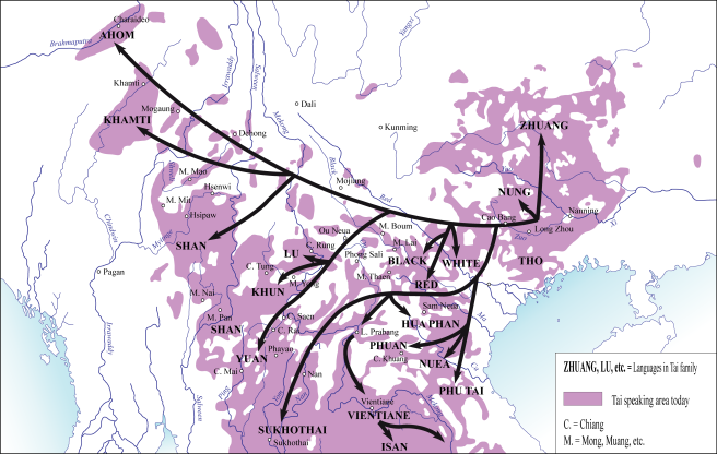 Bản đồ các hướng di cư của hệ ngữ Tai-Kadai. [9]