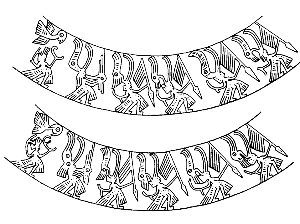 Hình ảnh người đội mũ lông chim trên trống đồng Đông Sơn. [8]