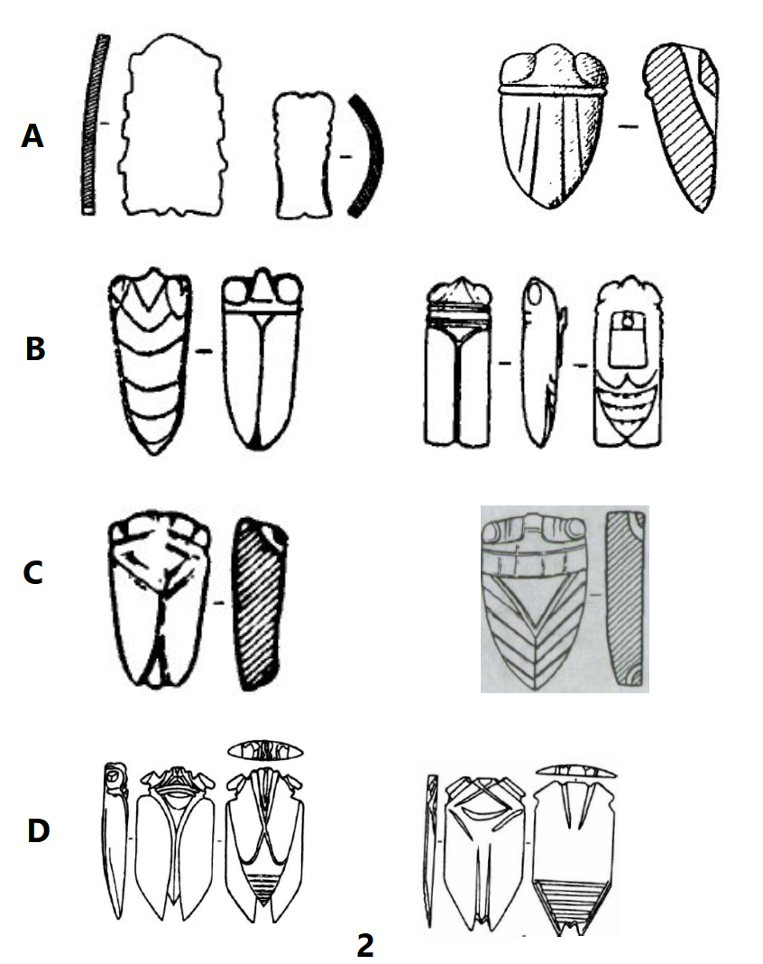 1. Ngọc ve sầu văn hóa Thạch Gia Hà, 2. Ngọc ve sầu các triều đại Hoa Hạ: A. Giai đoạn đầu Nhị Lý Cương, B. Nhà Thương, C. Tây Chu, D. Tây Hán. [21]