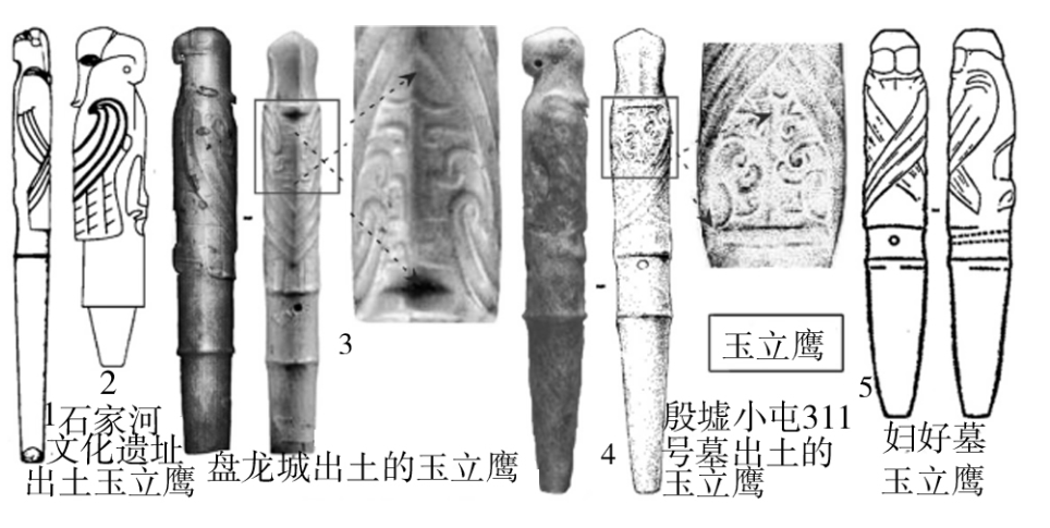 Đại bàng ngọc bích văn hóa Thạch Gia Hà (1,2) và của nhà Thương (3,4,5). [22]