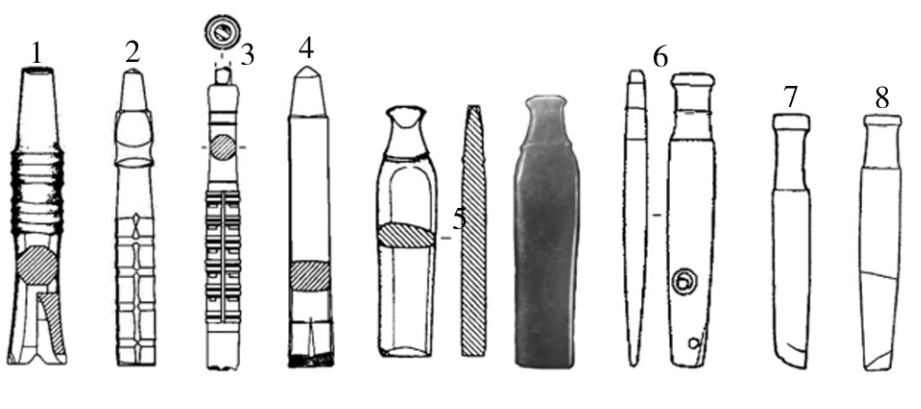 Gậy ngọc văn hóa Thạch Gia Hà (1-5) và nhà Thương (6-8). [22]