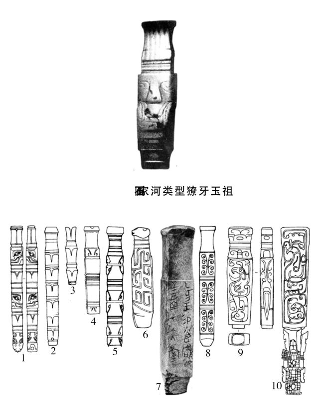 Nha ngọc văn hóa Thạch Gia Hà (trên) và nha ngọc nhà Thương (1-10). [22]