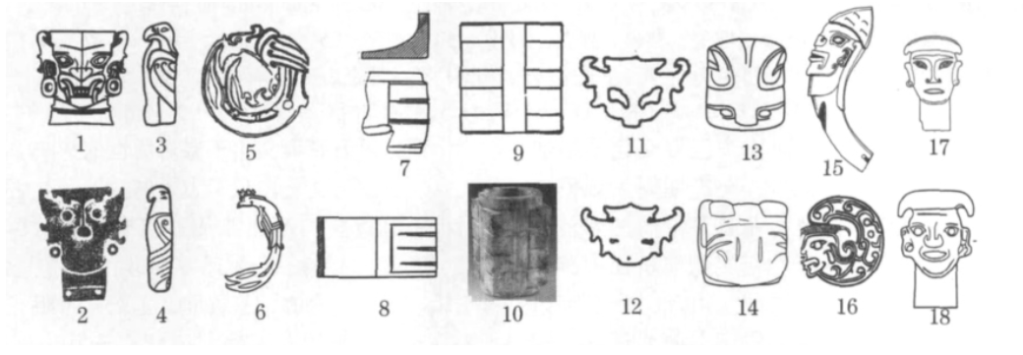 So sánh ngọc của văn hóa Thạch Gia Hà (trên) và ngọc của các vùng ảnh hưởng của văn hóa Thạch Gia Hà (dưới). Thứ tự các cổ vật ở hàng dưới: 2. Tây Chu, 4. Văn hóa Shimao, 6. Tây Chu (hậu Thạch Gia Hà), 8. Văn hóa Giao Tự (Taosi), 10. Kim Sa (Tứ Xuyên); 12, Taosi, 14. Shimao, 16. Xuân Thu, 18. Xuân Thu. [25]