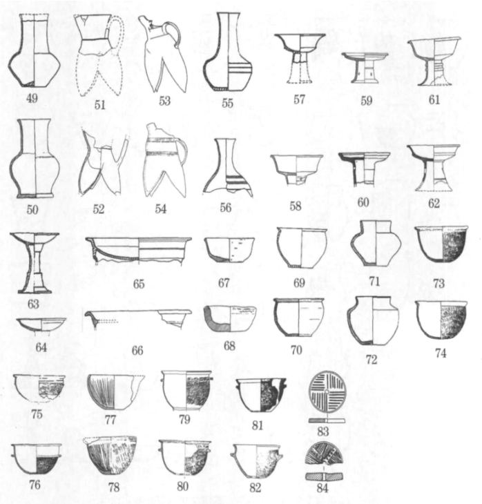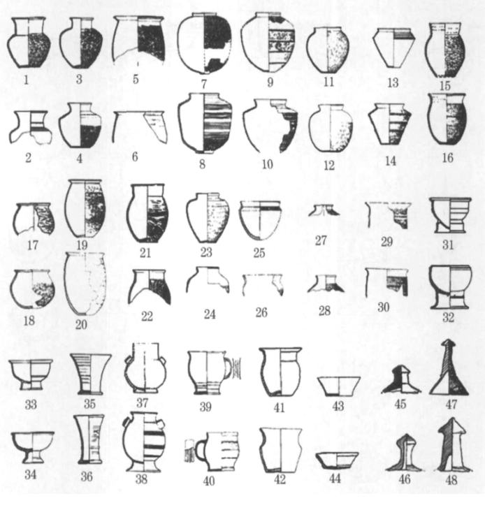 1-7: Loại hình Miếu Để Câu của văn hóa Ngưỡng Thiều, 8-14: Văn hóa Thạch Gia Hà và hậu Thạch Gia Hà. [25]