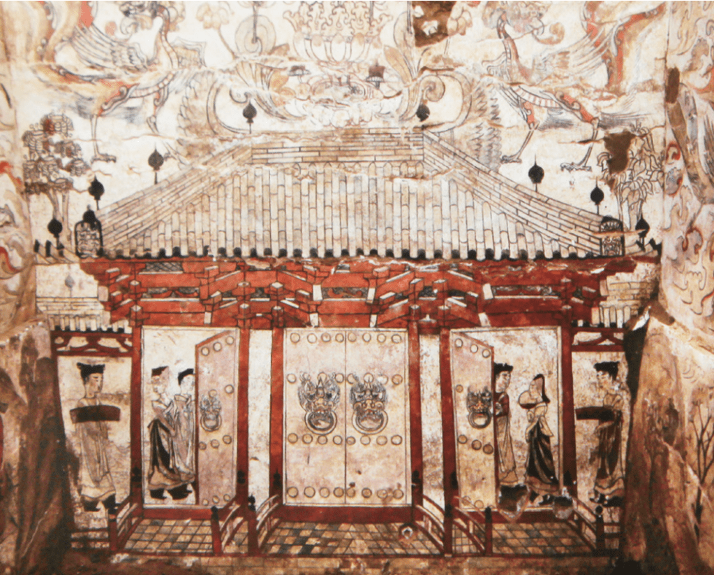 Bức tranh được vẽ trong lăng mộ thời Đông Ngụy tới Bắc Tề cho thấy kiến trúc si vẫn với hình dáng tương tự như lông chim trên trống đồng Đông Sơn. [29]