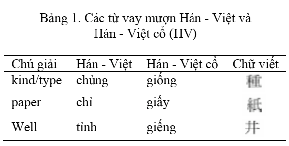 Thay vì các từ có nguồn gốc chung với tiếng Hán, tồn tại các tầng từ vay mượn từ tiếng Hán. Những nhà nghiên cứu như Vương Ly[17], Haudricourt [6], Đào Duy Anh[18] và các tác giả khác có sử dụng truyền thống âm vị lịch sử của tiếng Hán đã xác định được một tầng cổ xưa của từ vựng Hán từ Triều đại nhà Hán (năm 206 trước Công Nguyên đến 220 sau Công Nguyên), bằng cách xác định các mô hình thay đổi trong các phụ âm đầu và thanh điệu. Những từ như “kind/type”, “paper” và “well”cho thấy mô hình của âm vòm ban đầu và thanh sắc[19] được minh hoạ trong Bảng 1. Những từ như vậy thường được người Việt xem là một phần của chữ Nôm truyền thống, chữ viết biểu đạt tiếng Việt nói, chứ không phải là chữ Hán. Điều này trái ngược với một tầng từ vựng vay mượn sau này từ tiếng Hán thuộc triều đại nhà Đường (năm 618 – 907), được gọi là Hán – Việt, trong đó mỗi từ là một chữ viết Hán (Hán tự) phát âm kiểu Việt.