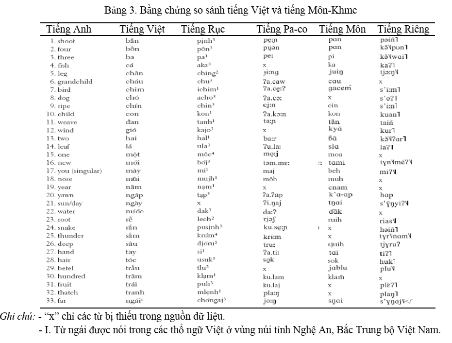 Cơ sở từ vựng học liên kết tiếng Việt với tiếng Môn-Khme gồm vốn từ vựng cơ bản chung chung về mặt ngữ nghĩa, và điều quan trọng là đó chính là vốn từ vựng liên kết giữa các ngôn ngữ khác với các tiểu nhánh của các ngôn ngữ Môn-Khme. Danh sách gồm một trăm từ mà Huffman đưa ra năm 1977 cho thấy vài chục(24) từ có thể là từ cùng gốc Việt/Khme với nhiều tương ứng về âm với hàng chục ngôn ngữ Môn-Khme khác. Điều mà bằng chứng này cho thấy là (1) vốn từ cơ bản, (2) sự tương ứng về âm vị, và (3) sự lan toả của vốn từ vựng này trong nội tại các ngôn ngữ cũng như giữa các tiểu nhánh của ngôn ngữ Môn-Khme. Điểm thứ ba làm cho các dữ liệu này trở nên có ý nghĩa về mặt phương pháp luận. Ví dụ về các vấn đề này được trình bày trong Bảng 3 (chữ viết từ các ấn phẩm gốc được giữa nguyên), gồm các tiếng Rục, một thổ ngữ nói Vietic ở tỉnh Quảng Bình[11]; tiếng Pa-cô ở tỉnh Thừa Thiên và Quảng Trị[35]; tiếng Mông ở Thái Lan và Miến Điện[30]; và tiếng Riang cũng ở Miến Điện[30]. Những từ không có trong dữ liệu được đánh dấu bằng ký hiệu “x”. Điều quan trọng là phải xem xét thực tế rằng các ngôn ngữ Môn-Khme khác bắt nguồn từ bốn tiểu nhánh khác nhau của Môn-Khme và bao phủ phạm vi địa lý rộng lớn, song tất cả đều có các từ nguyên Môn-Khme rất phổ biến này, một thực tế củng cố thêm việc gộp tiếng Việt vào họ Môn-Khme và làm suy yếu khả năng của một tình huống vay mượn nhiều về ngôn ngữ.
