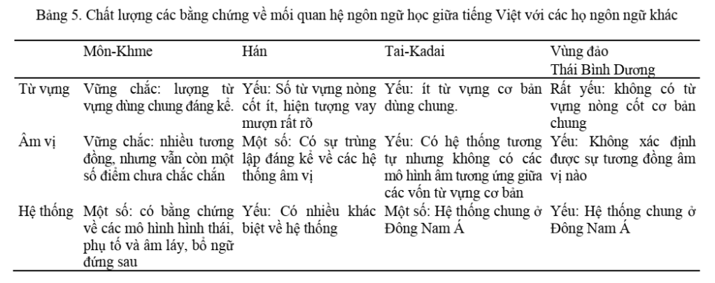 Tới thời điểm này, chúng ta có thể so sánh các giả thiết khác nhau về sức thuyết phục của các lập luận ngôn ngữ học và mức độ khả thi của các kịch bản nhân chủng học – lịch sử. Bảng 5 đưa ra sự đánh giá của tác gỉa về chất lượng của các bằng chứng ngôn ngữ học đối với các nhóm ngôn ngữ nguồn khác nhau. Chỉ có ngôn ngữ Môn-Khme được chứng minh là có chung kho từ vựng nòng cốt cơ bản với tiếng Việt, với lượng tương ứng âm vị bất qui tắc đáng kể, trong khi với các nhóm ngôn ngữ khác thì không có hiện tượng như vậy. Để bác bỏ vốn từ vựng cơ bản Môn-Khme trong tiếng Việt, cần phải loại bỏ phương pháp luận so sánh cơ bản, mà phương pháp này, dù không hoàn hảo, nhưng rất quan trọng cho việc sưu tầm thêm các bằng chứng về ngữ nghĩa. Về những vấn đề liên quan đến âm vị và chữ viết nói chung, giữa tất cả các nhóm ngôn ngữ đều có sự trùng lặp, và có lẽ đây là nguồn gốc lớn nhất của tình trạng nhầm lẫn trong quá trình nghiên cứu này. Có lẽ tốt hơn là coi các đặc điểm ngôn ngữ này ở vùng ngôn ngữ Đông Nam Á là kết quả của quá trình giao lưu ngôn ngữ lâu dài chứ không phải là có chung nguồn gốc ngôn ngữ.