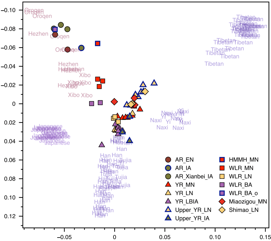 Nghiên cứu của Chao Ning et al. 2020 cho thấy mẫu gen của văn hóa Hồng Sơn (WLR _MN, hình vuông màu đỏ) gần với người Hezhen và Xibo. [23]