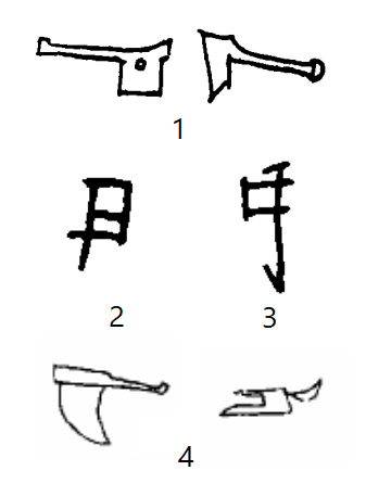 Biểu tượng Việt (chiếc rìu) trong các văn hóa: 1. Đại Vấn Khẩu, 2. Đại Khê, 3. Lương Chử, 4. Văn hóa Thạch Gia Hà. [55]