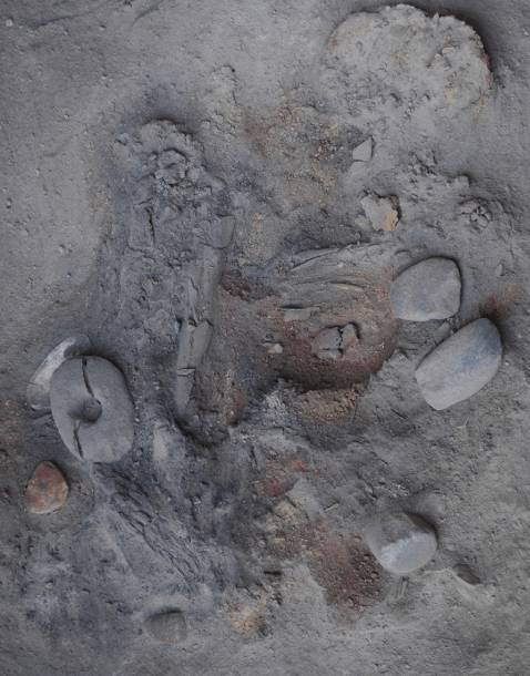 Đá đục lỗ được chôn cùng người chết chứng tỏ nó có ý nghĩa tâm linh rất quan trọng. Trong ảnh là đá đục lỗ trong ngôi mộ tại Doi Pha Kan. [18]