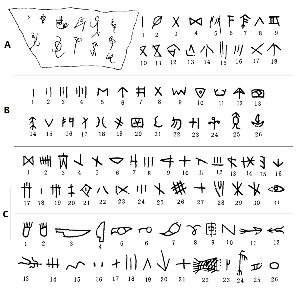 Một số ký tự của các văn hóa Hoa Hạ: A. Long Sơn; B. Nhị Lý Đầu; C. Nhà Thương. [20]