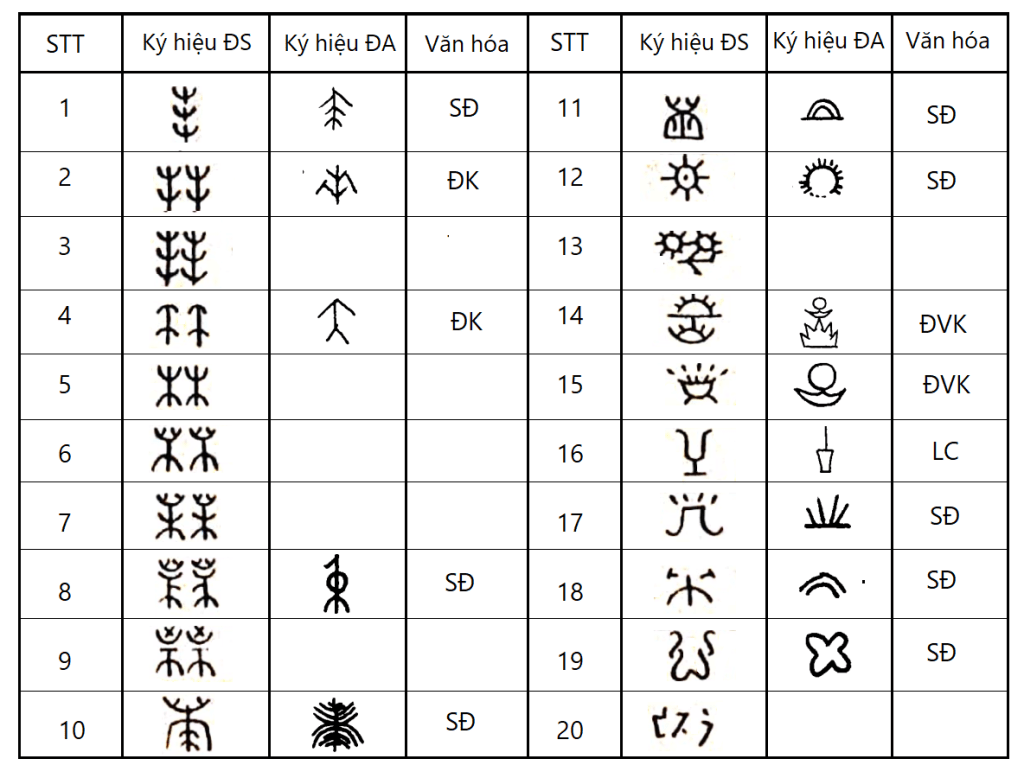So sánh một số chữ trên các qua đồng văn hóa Đông Sơn và văn hóa Đông Á cổ. Từ viết tắt: ĐS: Đông Sơn; ĐA: Đông Á; SĐ: Song Đôn, ĐK: Đại Khê, ĐVK: Đại Vấn Khẩu, LC: Lương Chử.