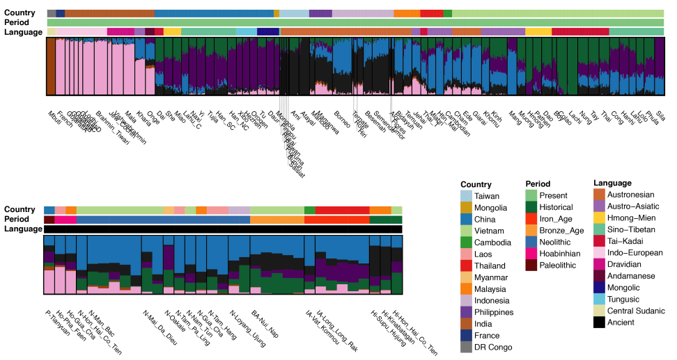 [15] Lipson M, Cheronet O, Mallick S, Rohland N, Oxenham M, Pietrusewsky M, Pryce TO, Willis A, Matsumura H, Buckley H, Domett K, Nguyen GH, Trinh HH, Kyaw AA, Win TT, Pradier B, Broomandkhoshbacht N, Candilio F, Changmai P, Fernandes D, Ferry M, Gamarra B, Harney E, Kampuansai J, Kutanan W, Michel M, Novak M, Oppenheimer J, Sirak K, Stewardson K, Zhang Z, Flegontov P, Pinhasi R, Reich D. Ancient genomes document multiple waves of migration in Southeast Asian prehistory. Science. 2018 Jul 6;361(6397):92-95. doi: 10.1126/science.aat3188. Epub 2018 May 17. PMID: 29773666; PMCID: PMC6476732.