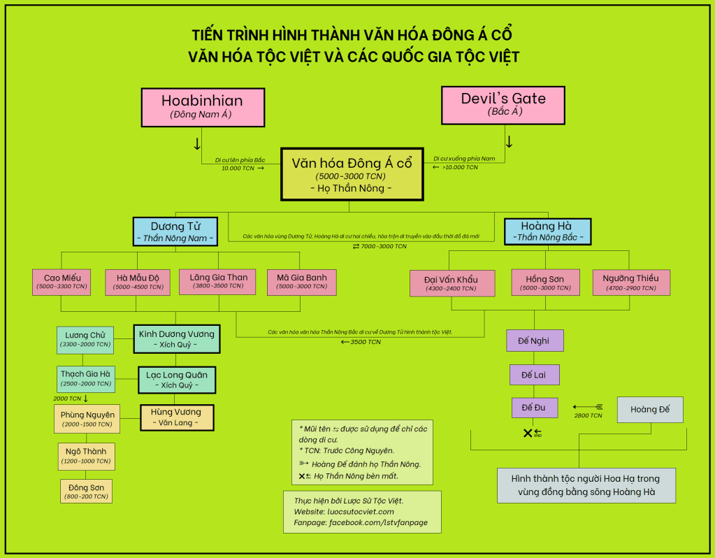 Sơ đồ phân tích tiến trình phát triển của văn hóa Đông Á cổ và văn hóa tộc Việt, kết hợp giữa di truyền, khảo cổ, lịch sử (thành văn và truyền miệng).