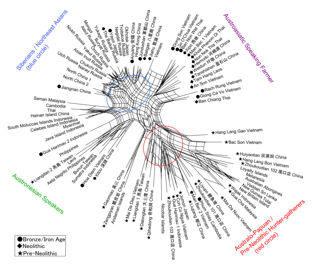 Tạm dịch: “Bằng cách kết hợp các mẫu cổ từ SEA và Trung Quốc, chúng tôi đã chỉ ra rằng tổ tiên AA đã tăng lên trong thời kỳ đồ đá mới, tiếp theo là sự gia tăng của tổ tiên AN, HM / TK hoặc ST (theo khu vực) trong các thời kỳ sau đó. Sự luân chuyển dân số này từ thời kỳ đồ đá mới sang các thời kỳ sau, với sự bổ sung nguồn gốc có liên quan đến người Trung Quốc, phù hợp với các nghiên cứu khảo cổ học và ngôn ngữ học, nhưng mâu thuẫn với một nghiên cứu trước đó, dựa trên việc lấy mẫu hạn chế hơn, cho rằng phần lớn nguồn gốc bản địa của các nhóm Việt Nam (Le et al. 2019).”