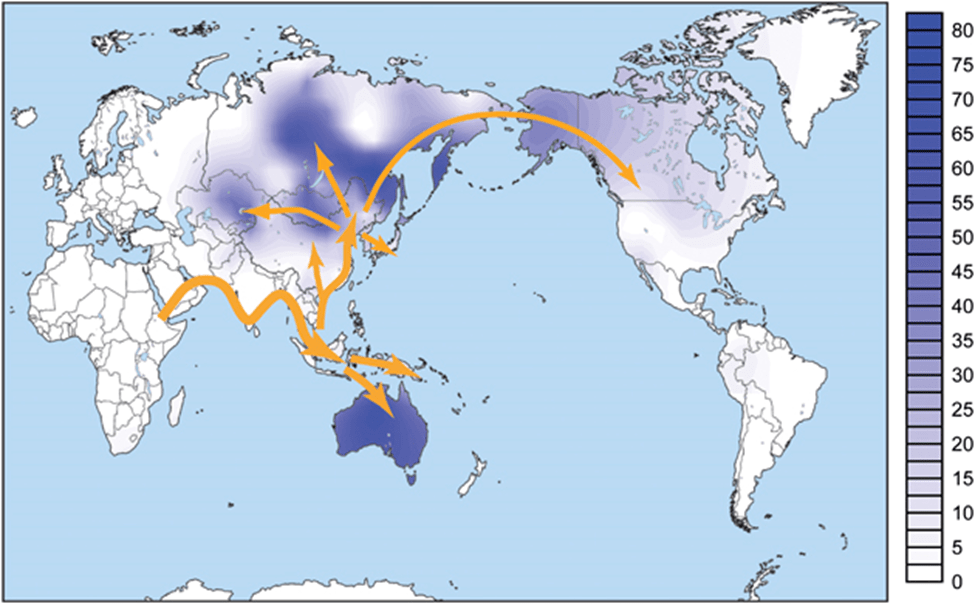Hình 1: Một ví dụ về sự di cư của cư dân Đông Nam Á: các tuyến đường di cư của haplogroup C (Zhong et al., 2010).