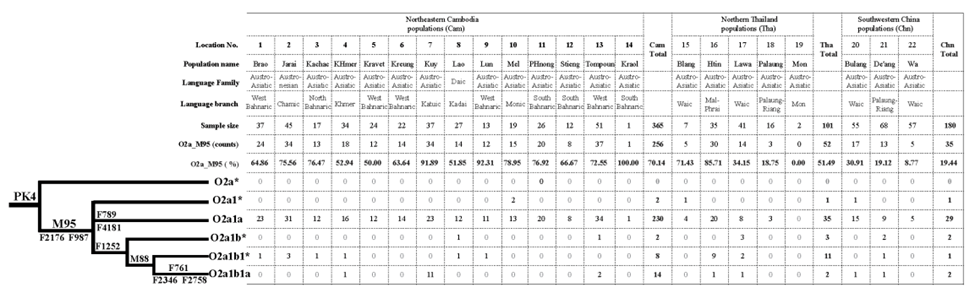 Qua so sánh và thống kê chi tiết tỉ lệ O2a và nhánh phụ của nó là O2a1 và O1a cùng nhánh phụ của nó là O1a2, cho thấy rất rõ được nguồn gốc của các dân tộc thuộc ngữ hệ Tai-Kadai. Có thể thấy, phần lớn các dân tộc có tỉ lệ O2a và nhánh phụ cao hơn, tỉ lệ dao động rất lớn, từ 8.7% đến 85.7%.